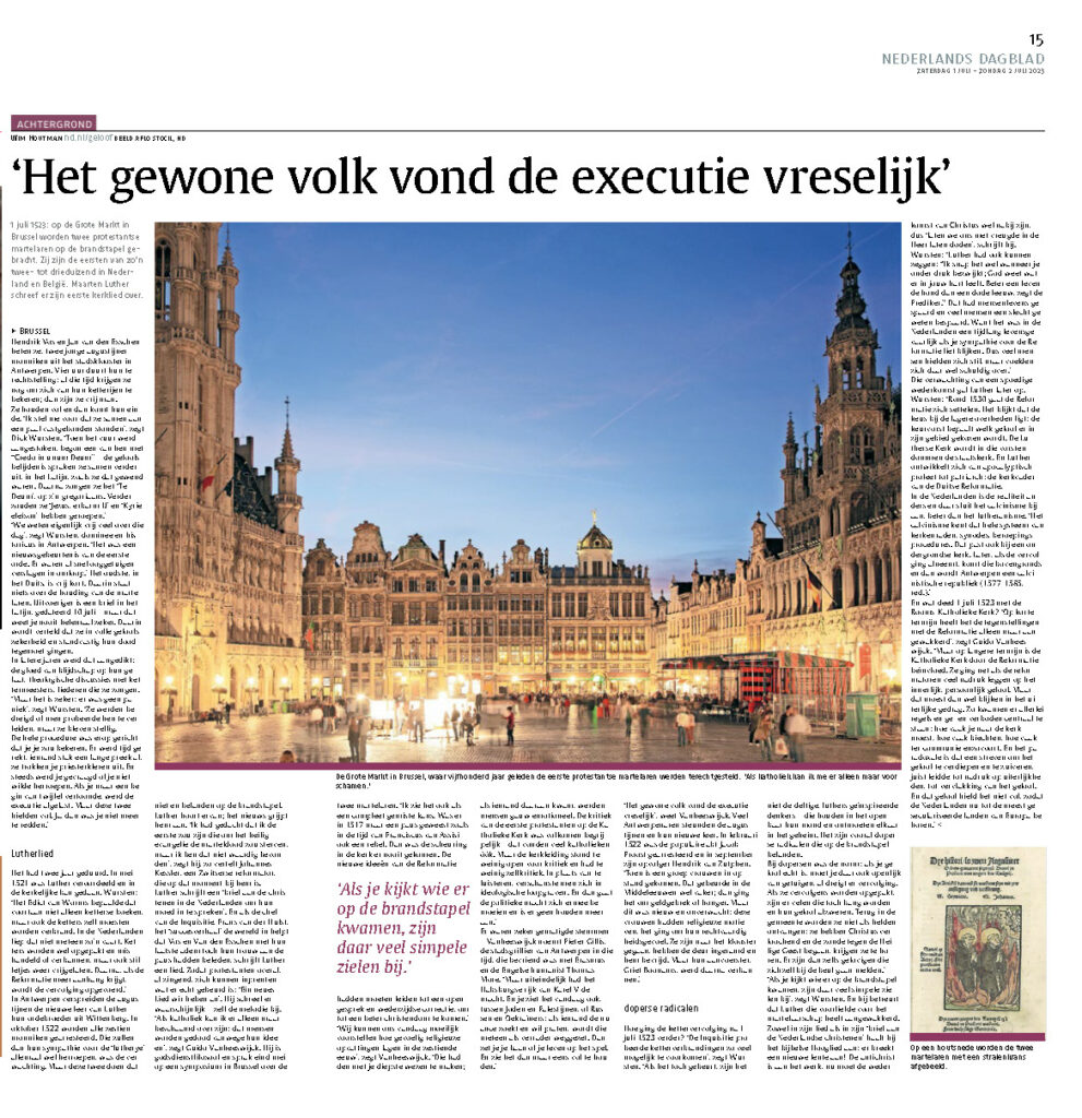 1 juli 1523: op de Grote Markt in Brussel worden twee protestantse martelaren op de brandstapel gebracht. Zij zijn de eerste van zo’n twee- tot drieduizend in Nederland en België. Maarten Luther schreef er zijn eerste kerklied over.