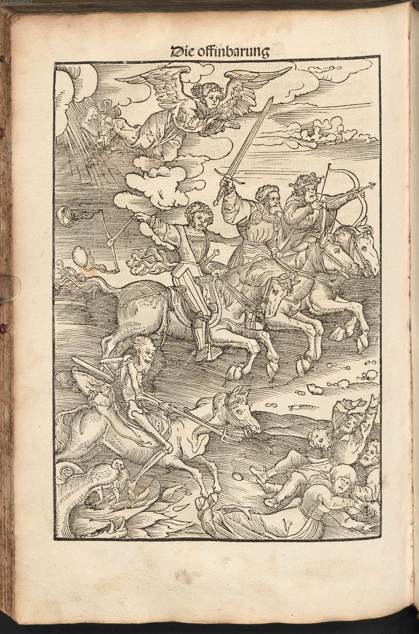 Dürer 1498 en Cranach 1522. Zie de overeenkomsten… zeker: Cranach kopieert/plagieert. Tegelijk: zie ook de verschillen. Hoeveel dynamischer, donderend-dreigend, stormen Dürers ruiters over de aarde. Over de bijbeleditie met de gravures van Cranach – de Cranach-apocalyps, klik hier. geïnteresseerd in de hele reeks gravures van Dürer, op flashbak staan ze alle in hoge resolutie