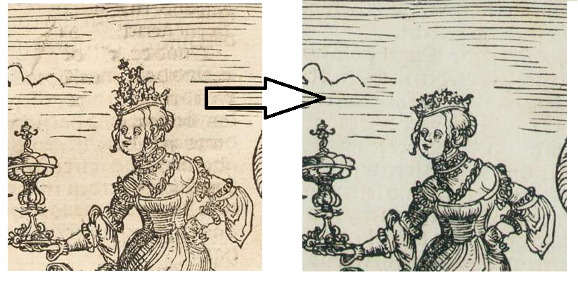 Als ik wat inzoom op de vrouw, komt ze me bekend voor. En opeens weet ik het weer. Het is de vrouw die hij al eens eerder heeft geschetst, in Venetië, maar dan wat ouder geworden. Een Venetiaanse vrouw (een courtisane?). Ze heeft zelfs nog dezelfde kleren aan. Hieronder ziet u links de tekening van een Venetiaanse vrouw Dürer/1495; en rechts de 'hoer van Babylon' uit de Apocalyptische ets Dürer/1498. Terzijde: het feit dat Dürer z'n eigen schets heeft gebruikt voor de ets, is niet nieuw. Nadat ik het zelf had ontdekt, heb ik de gekende monografie over Dürer van Heinz Lüdecke nog eens opgeslagen uit 1970. En ja hoor, daar staat dat ook al gewoon in.1