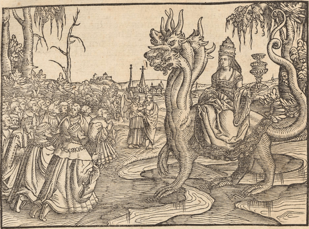 In Luther's tijd roept Rome echter vooral kerkelijke associaties op. Niet de keizer, maar de paus 'afhoereert' met het 'beest uit de afgrond' aan wie alle vorsten der aarde tol betalen, tribuut betuigen: De paus is satan, de anti-christ. Hier zit ze, op het zevenkoppige monster uit de afgrond/zee.