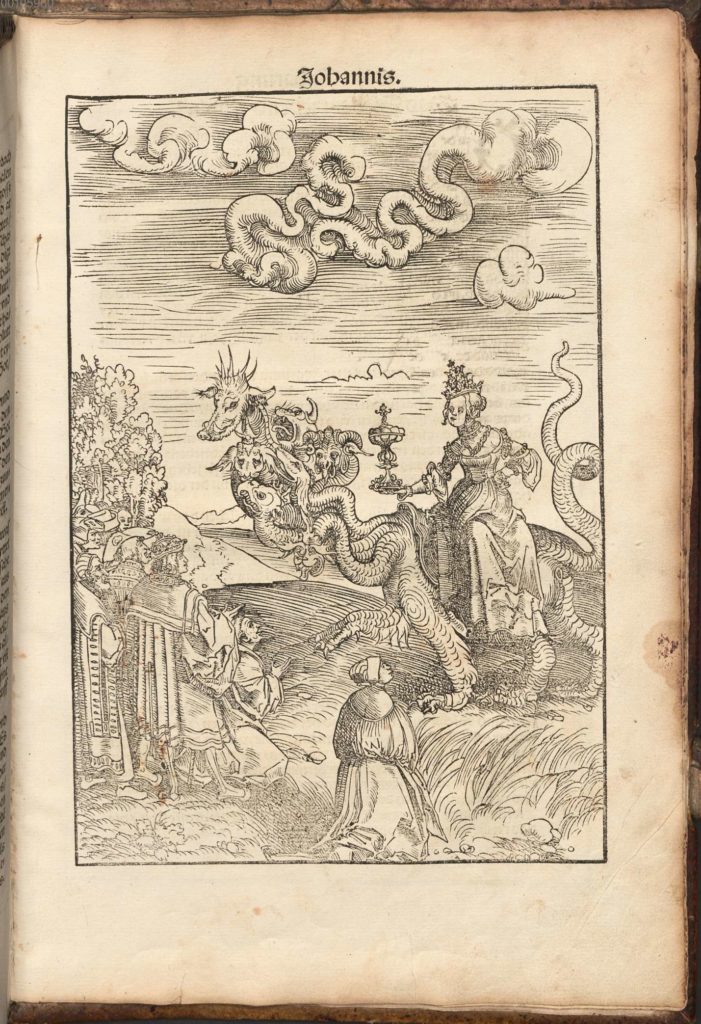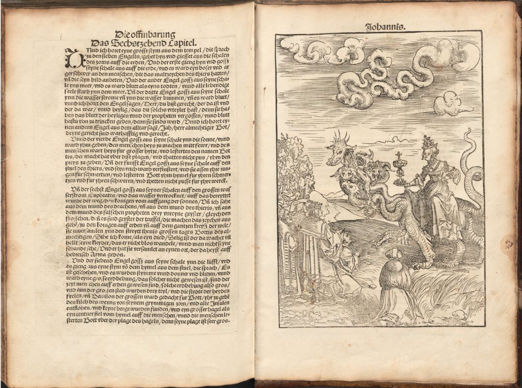 Een zeer opvallend kenmerk van de eerste editie van Luthers (Duitse) Nieuwe Testament (september 1522) is het feit dat in deze editie maar liefst 15 volwaardige, bladzij-grote gravures zijn opgenomen, allemaal afkomstig uit de 'shop' van Lucas Cranach sr. (drukker: Melchior Lotter), allemaal ter illustratie van het laatste bijbelboek, de 'Openbaring van/aan Johannes'. Inspiratie haalde Cranach overduidelijk bij Albrecht Dürer, die reeds in 1498 een geïllustreerde Apocalyps het licht had doen zien (15 schitterende houtsnedes), waarvan vooral the four horsemen of the Apocalyps nog steeds tot de verbeelding spreken. Op de pagina naast hoofdstuk 16 zien we 'de hoer van Babylon', gezeten op een zevenkoppig monster met 10 horens. Voor haar knielen 'de vorsten der aarde'. Dit is het visioen dat in het volgende hoofdstuk (17) wordt geëvoceerd.